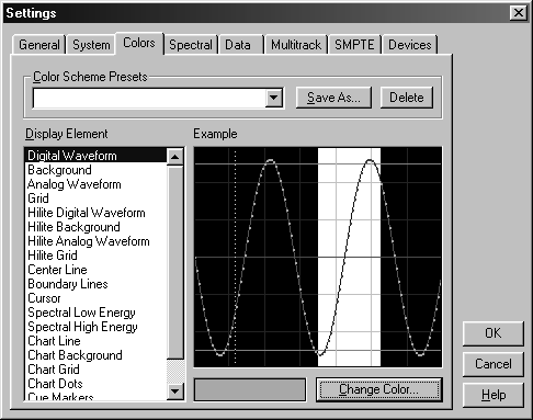 На этой вкладке устанавливаются цвета различных элементов главного окна (цвет курсора, отображения звуковой волны, фона на котором она отображается и т. п.). Для того чтобы изменить цвет какого-либо элемента, необходимо выбрать этот элемент в списке Display Element (Отображаемый элемент), а затем нажать кнопку Change Color (Изменить цвет). В результате на экране появится стандартное диалоговое окно установки цвета, в котором надо выбрать требуемый цвет и нажать кнопку ОК. В поле Example (Пример) отображается вид интерфейса программы после произведенного изменения цветов.