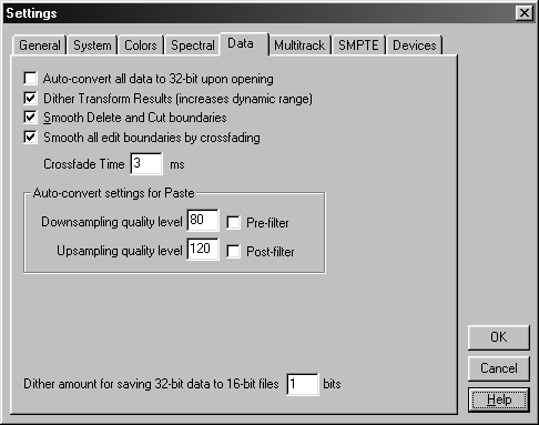 И наконец, в самой нижней части вкладки Data (Данные) расположено поле ввода Dither amount for saving 32-bit data to 16-bit files … bits (Степень дизеринга при сохранении 32-битных данных в 16-битном формате). В этом поле ввода определяется, будет или нет производиться дизеринг (о нем рассказывалось чуть выше в этом же разделе) при сохранении 32-битных данных в 16-битном формате. Если задано значение 0, то дизеринг производиться не будет, а при значении 1 дизеринг производится. Кроме того, можно также применять частичный дизеринг, задав в этом поле ввода значение 0,5.