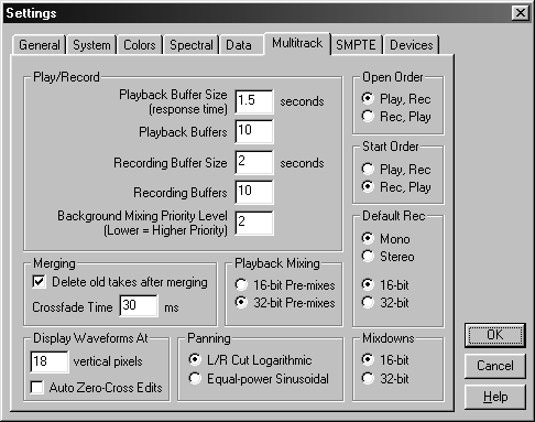 Рис. 1.15. Вкладка Multitrack диалогового окна Settings