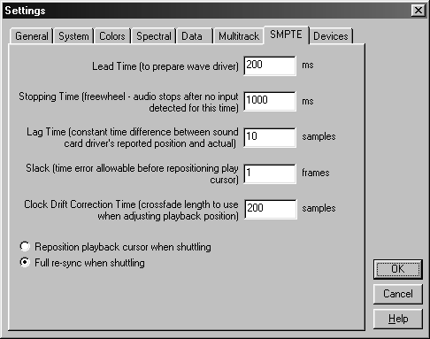 Рис. 1.16. Вкладка SMPTE диалогового окна Settings