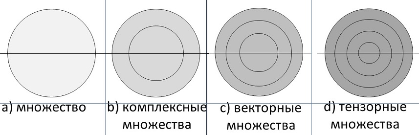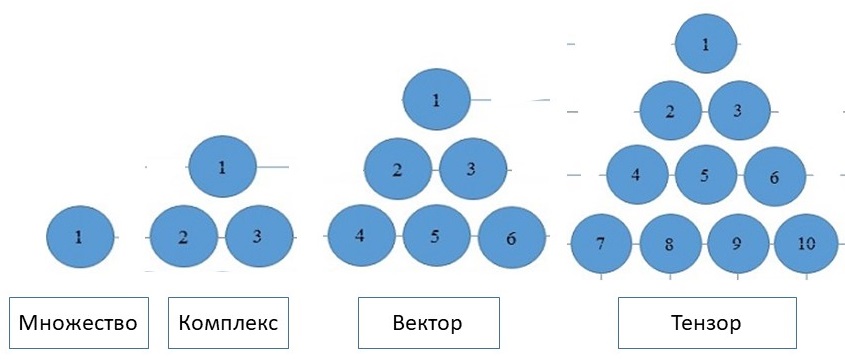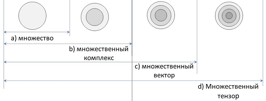 Множество должно быть количеством чего-то, в данном случае, первичных объектов. как основополагающих: множества, комплексов, векторов и тензоров. Все четыре объекта, как единичные элементы, являются целостными образованиями и образуют соответствующие множества. Схематично это можно представить следующим образом (рис. 1):