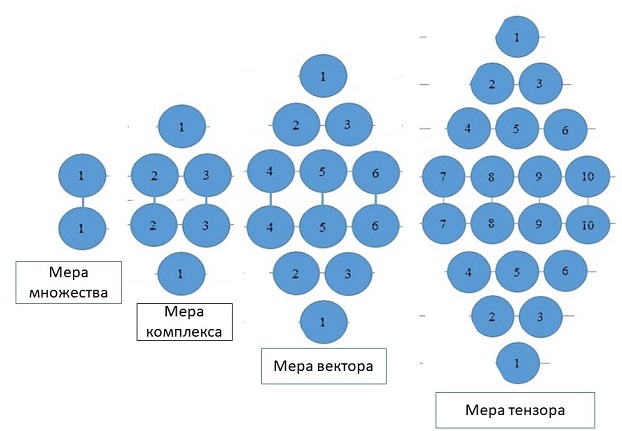 В соответствии с требованиями системности первый элемент (множество) должен быть целостным с единой структурой, второй (функции) должен иметь два элемента, третий (вектор) – три, а четвертый (тензор) – четыре.
