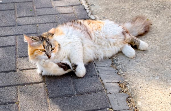 Мордоворот подошел к кошечке и улегся рядом, но она делала вид, что не заметила потасовки, и умывалась лапкой.