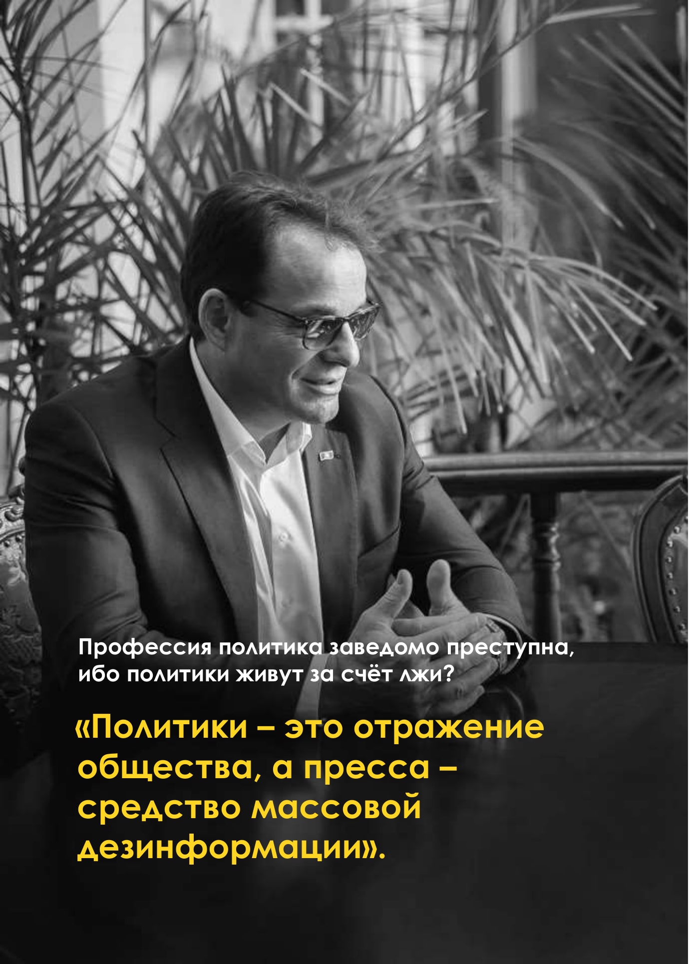 Мы говорим о свободе слова, о независимой прессе… Но какая же она независимая, если часть журналистов готова за деньги написать всё, что угодно. Политики – это отражение общества, а пресса – средство массовой дезинформации. Это замкнутый круг.
