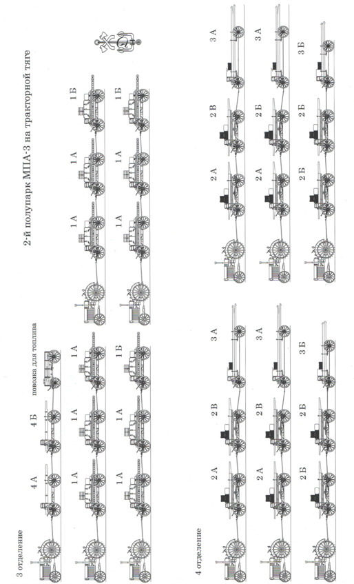 Парк МПА-2 перевозился на 66 повозках (64 мостовых и 2 цистерны) с помощью 22 тракторов Интернационал (тракторный поезд состоял из 3 повозок) или на пароконных повозках, для чего короткое прицепное устройство менялось на дышло.