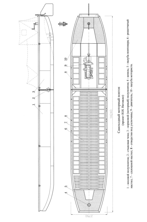 Кормовой (моторный) полупонтон служил для размещения винтомоторной группы, рулевого устройства и топлива. Двигатель устанавливался на фундаменте и крепился к шпациям болтами. Охлаждение двигателя производилось забортной водой. От коробки передач вращение, через промежуточный вал передавалось на гребной вал.