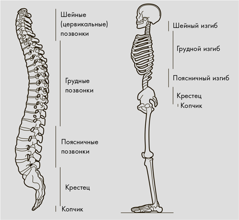 Позвоночник – удивительная, сложная и притом весьма гибкая структура. Он начинается у основания черепа, а заканчивается тазом и служит своеобразной колонной, держащей на себе вес нашего тела и защищающей спинной мозг. На позвоночнике есть три природных изгиба, которые делят его на три отдела: цервикальный (или шейный, в него входят шея и верхняя часть спины), торакальный (плечи и грудь) и поясничный (поясница, нижняя часть спины). Изгибы придают позвоночнику форму буквы S, если посмотреть сбоку, и помогают гармонично распределять вес тела, чтобы мы не падали вперед и не заваливались назад. (На самом деле позвоночник находится не совсем сзади, как может показаться, а практически по центру человеческого тела. Благодаря этому мы не опрокидываемся.)