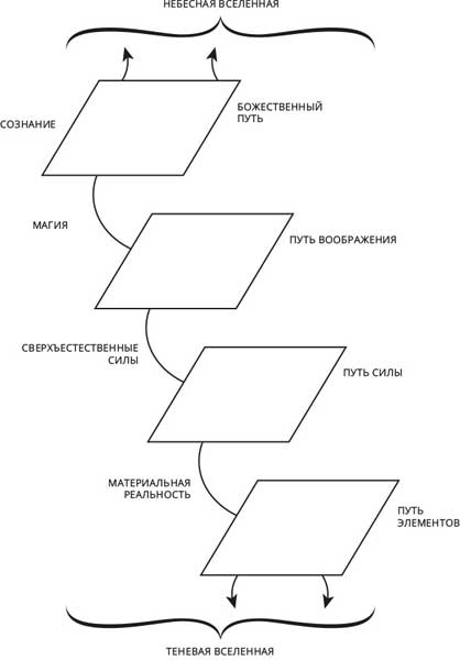 Рис. 1. Четыре пути и две вселенные. Четыре пути связывают небесную вселенную и теневую. Здесь они расположены друг над другом, но они взаимосвязаны и объединяются