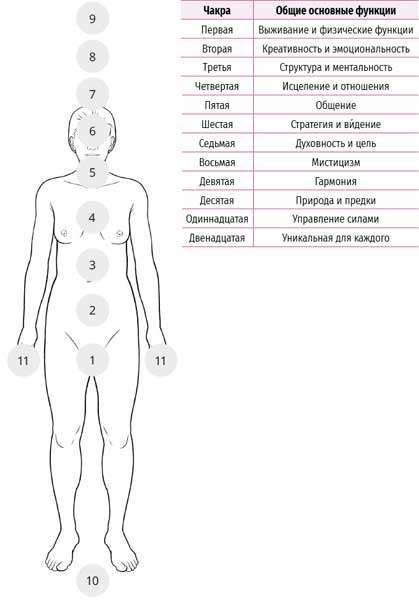 Почти вечность назад я разобралась с первой проблемой: все дело в чакрах. Выйти на все пути и в обе вселенные можно через эти энергетические проходы, а они доступны нам всем. Чакры являются ключевыми фокусными точками человеческой энергетической системы, также называемой тонким телом и тонкой энергетической анатомией. Они представляют собой сложный набор тонких энергетических тел, которые регулируют все компоненты организма. На самом деле каждая из четырех чакр, с которыми я работаю, управляет определенным набором физических, психологических и духовных функций. Расположение чакр и их базовые функции отражены на рис. 2.