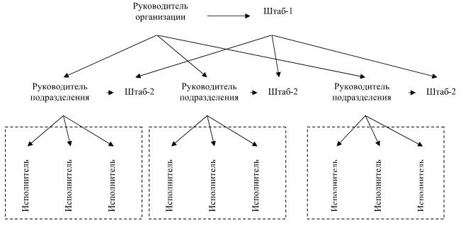 Линейно-штабная структура предусматривает создание социальных, профессиональных и консультационных подразделений руководителя. В основном эта структура применяется на предприятиях средней величины.
