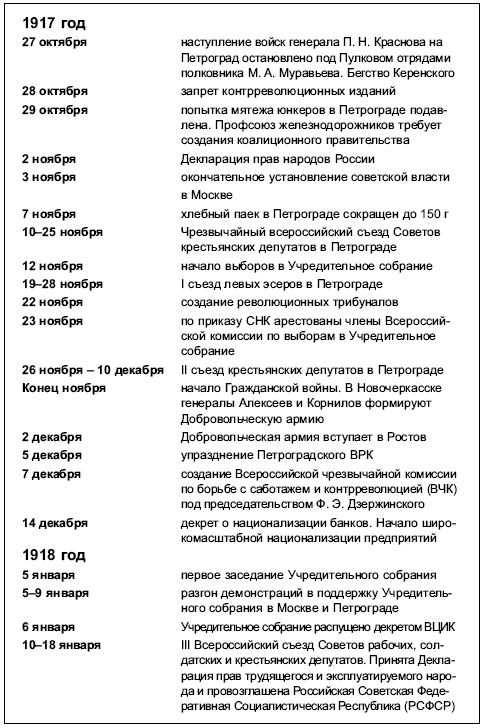 Надвигающаяся зима сулила голод. Большевики заранее договорились с левыми эсерами, что деятельность Учредительного собрания должна быть прекращена, если оно не одобрит законов и декретов, принятых Совнаркомом и съездом Советов. В ночь с 5 на 6 января 1918 года так и случилось. Накануне была расстреляна демонстрация в поддержку Учредительного собрания. Новая власть показала силу, и защищать Учредительное собрание никто не стал. Большевики тоже не спешили решать, какой будет новая власть. Они ждали мировую революцию.