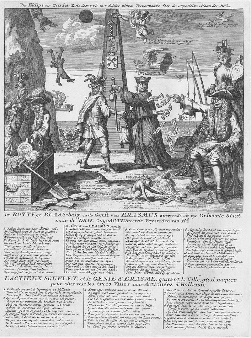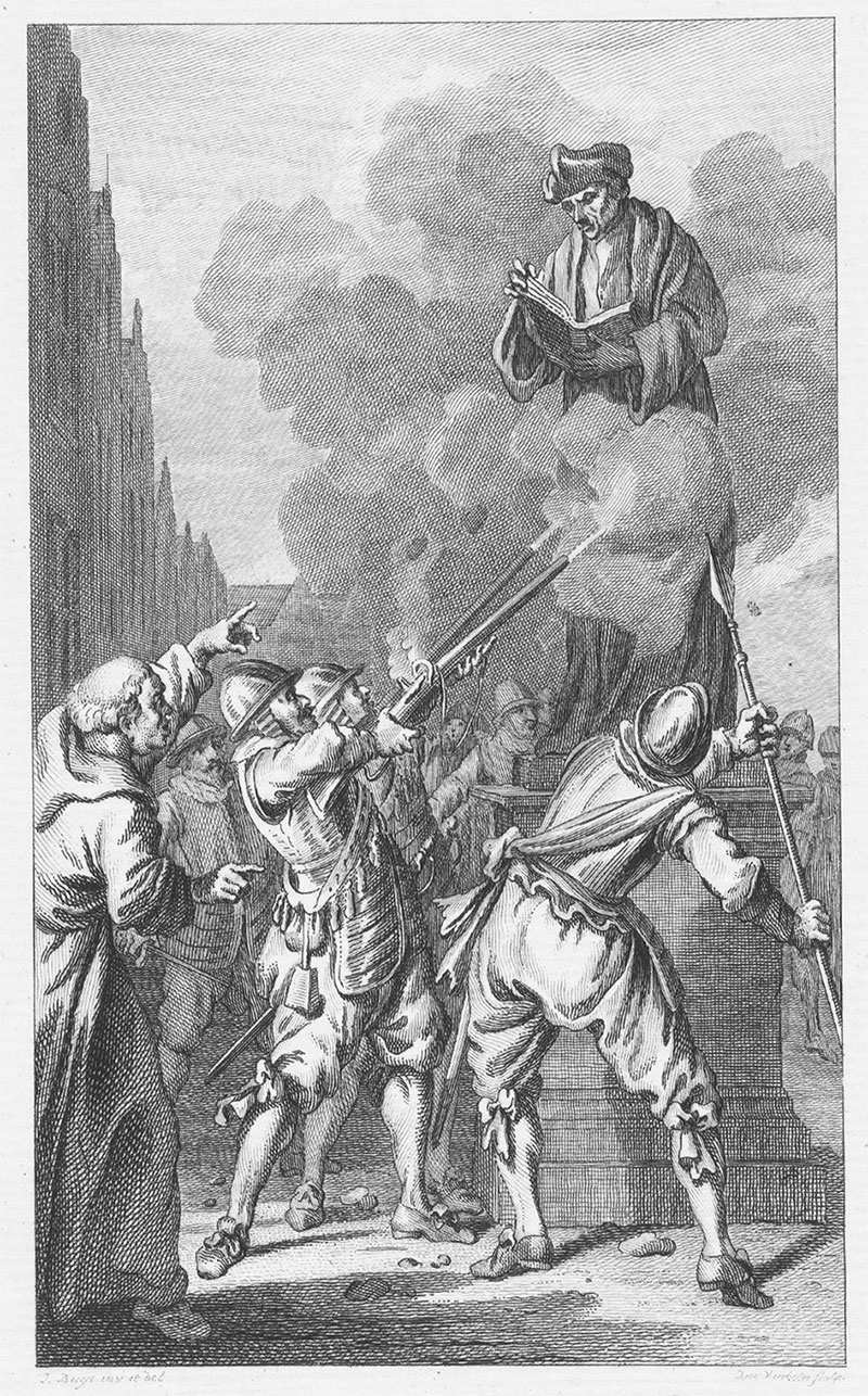 Испанские солдаты стреляют в статую Эразма Роттердамского в 1572 году.