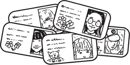 On the back of the cards we wrote our names, ages, addresses and hobbies. When we’d finished them we signed them. Well, the rest of us did. Kenny did this weird squiggle that looked as if someone had nudged her elbow. Then we passed them round and read each others’.