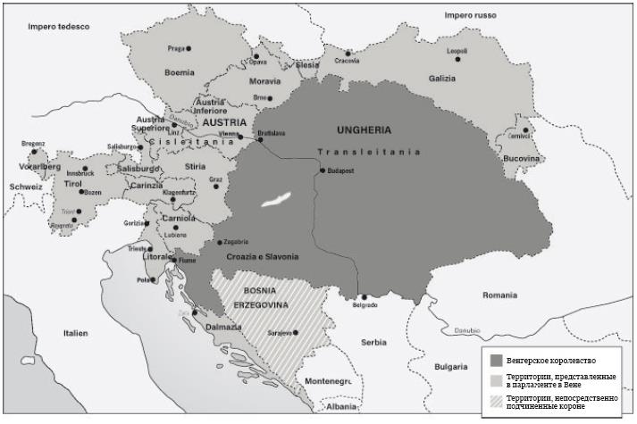 Венгры представлялись единственными, кто предлагал прочную основу для государственного союза, учитывая раздробленность славянского мира, разделенного на чехов, словаков, поляков, рутенов, хорватов, словенцев, сербов. Соглашение, или компромисс (Ausgleich) 1867 г. признал особый статус венгров, приравненный к статусу немцев, и создал Двуединую монархию (Doppelmonarchie), институциональную структуру, остававшуюся почти неизменной до момента распада империи. Монархия теперь становилась Австро-Венгерской, основанной на союзе двух независимых государств с равными прерогативами, которыми правил один и тот же государь – император Австрийский и король Венгерский. Каждое государство имело свой собственный парламент и свое правительство и независимо осуществляло большинство своих полномочий, делегируя трем общим министерствам управление иностранными делами, обороной и общим налогообложением. В десятилетнем соглашении между двумя сторонами была установлена квота финансирования каждой из них для покрытия общих расходов[14]. Это породило сложную и оригинальную конституционную структуру, которую нельзя было назвать федерацией, потому что не существовало высшего органа для двух государств, как нельзя было назвать и конфедерацией, так как ее компоненты не имели суверенитета. В последующие десятилетия напряженность между Австрией и Венгрией не ослабевала из-за различных толкований Соглашения, но в целом оно гарантировало достаточную внутреннюю стабильность в последние полвека жизни империи, переименованной после 1867 г. в Австро-Венгрию.