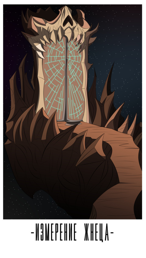 Жнец стоял перед алтарём. Слишком высокий для человека, ростом почти в три метра, сгорбившийся, в багровой ветхой мантии и с громадной костяной косой, рукоять которой некогда являлась чьим-то хребтом. Руки Жнеца, выглядывающие из глубоких рукавов мантии, были иссохшими и когтистыми, а головой ему являлся большой череп какой-то доисторической птицы с полуметровым клювом, торчавшим далеко вперёд. Черноту пустых глазниц Жнеца можно было сравнить лишь с вороньим опереньем, занимавшим его грудь, плечи и горб.