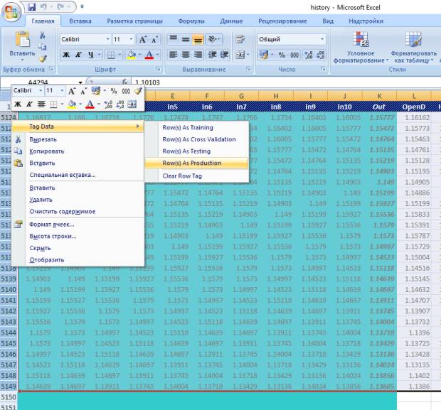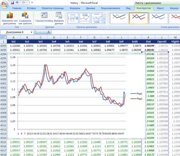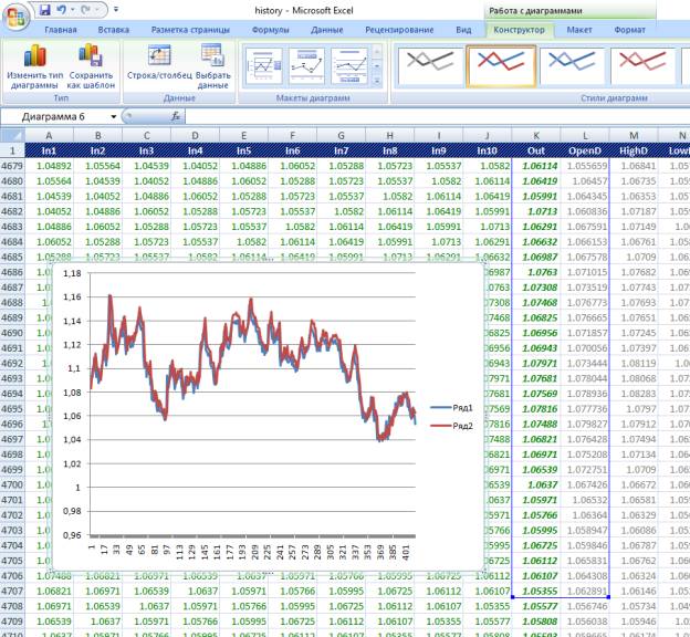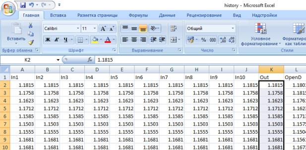 Таким образом, мы получим в каждой строке вектор из дневных цен закрытия с глубиной в десять дней – это будут входы нейросети. А в столбце Out, который также сдвинут на один день вперед по отношению к In10, будут обучающие примеры закрытия дня для нейросети.