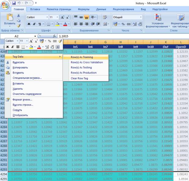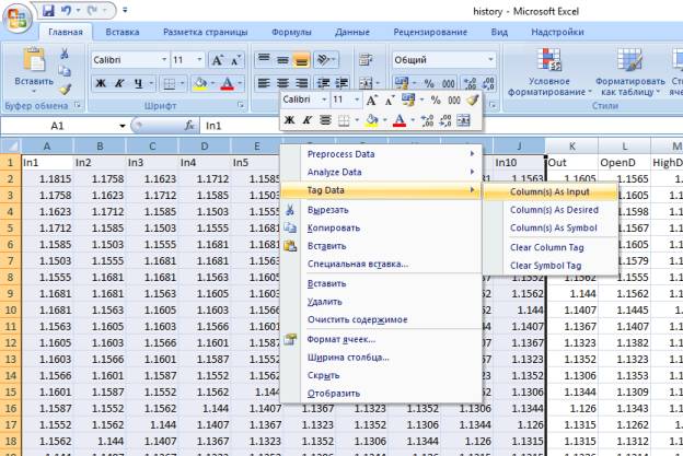 С помощью надстройки NeuroSolutions, выделив столбцы In1-In10, отформатируем их как входы.