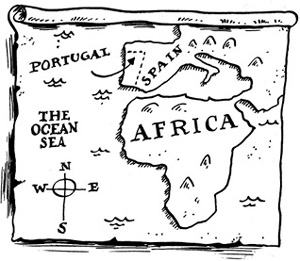Of course he isn’t the only one to have these big ideas. For a long time sailors from over the border in Portugal have been exploring down the coast of Africa. Until four years ago, all they did was keep sailing southwards. They reckon that if they keep going, they’ll find a new route to the Indies. But it wasn’t much use, because to get to the Indies you have to go eastwards. That was one of the first things I learned from Master Isaac. So I guess the Portuguese are going to be sailing forever.