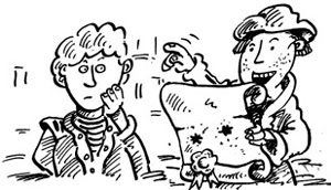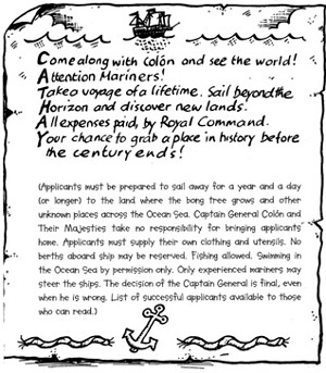 It sounds sort of secret (not to mention magical), so it should be exciting. I pricked up my ears, though nobody else was that thrilled. You see, the proclamation also says that because the people of Palos have been breaking the law by trading along the North African coast and upsetting the King of Portugal, they’ve got to provide this Cristobál Colón2 (I think that’s the Captain General’s name) with two ships and all the food and equipment needed for a voyage lasting a year.