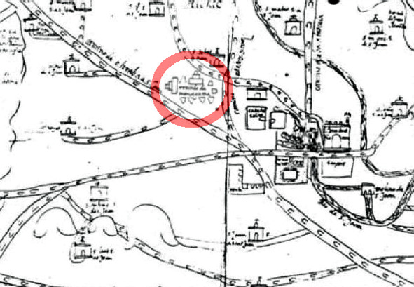 Деталь карты из Relacion geografica de San Juan Teotihuacan 1580 года, где показан план древнего церемониального центра Теотиуакана (по Gamio 1922, lam.140)