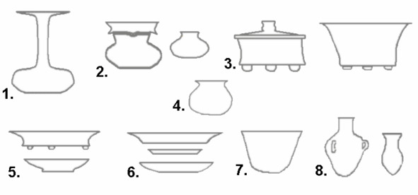 Контуры керамических изделий Теотиуакана (размеры не соблюдены): 1. «флореро»; 2.кувшины; 3. вазы; 4. «олла»; 5. чаши; 6. тарелки и блюдца; 7. «кратер»; 8. «амфоры»