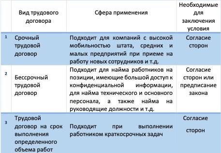 После подписания кандидатом письма с предложением о работе, компания должна в течение 30 дней с момента, когда кандидат приступил к работе, заключить с ним/ней трудовой договор. Однако конкретный вид трудового договора между компанией и работником во многом будет зависеть от формы занятости и других отдельных условий. В этой главе мы рассмотрим существующие виды трудовых договоров в Китае и их основные отличия.