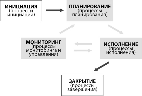 Вообще, в жизненном цикле проекта выделяют пять этапов управления проектом: