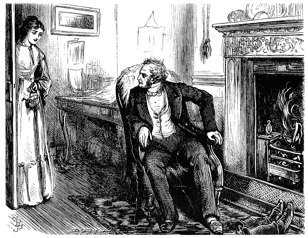 – Присаживайтесь, дорогая, – сказал мистер Джарндис. – Эта комната, к вашему сведению, называется Брюзжальней. Когда я не в духе, я удаляюсь сюда и брюзжу.