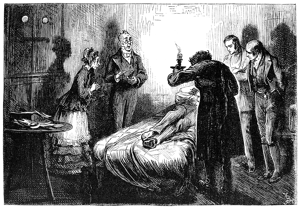 – Скорее, Флайт, скорее! Сбегайте за доктором! Бегите же! – торопит мистер Крук полоумную старушку, свою жилицу, а та, мгновенно появившись и столь же мгновенно исчезнув, вскоре возвращается в сопровождении раздраженного медика, которому она помешала обедать, – мужчины с заметно потемневшей от нюхательного табака верхней губой и заметным шотландским акцентом.