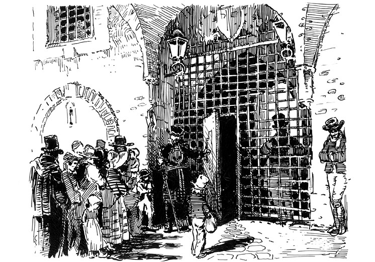 В первое же воскресенье после его ареста я должен был его навестить и пообедать вместе с ним. Я должен был спросить, как пройти к такому-то дому, и сразу за этим домом должен был увидеть другой дом, а сразу за этим другим домом должен был увидеть двор, который надлежало пересечь и идти прямехонько, не сворачивая, пока не увижу тюремного сторожа. Так я и поступил, и, когда наконец увидел тюремного сторожа, у меня (бедный я мальчуган!) мелькнула мысль о пребывании Родрика Рэндома в долговой тюрьме, где вместе с ним был заключенный, не имевший никакой одежды и закутанный только в старое одеяло, и сторож вдруг расплылся у меня в глазах, потому что они заволоклись слезами, а сердце заколотилось в груди.