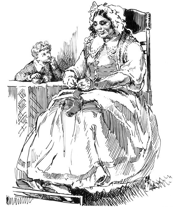Вот тут мы все трое заплакали. Кажется, я плакал громче всех, но все плакали непритворно. Я был в полном отчаянии и боюсь, что, оскорбленный в самых нежных своих чувствах, назвал Пегготи «свиньей». Помню, славная женщина была глубоко опечалена и, должно быть, осталась по этому случаю совсем без пуговиц, потому что раздался своего рода залп и эти снаряды отлетели, когда она, помирившись с моей матерью, опустилась на колени перед моим креслом и помирилась со мною.