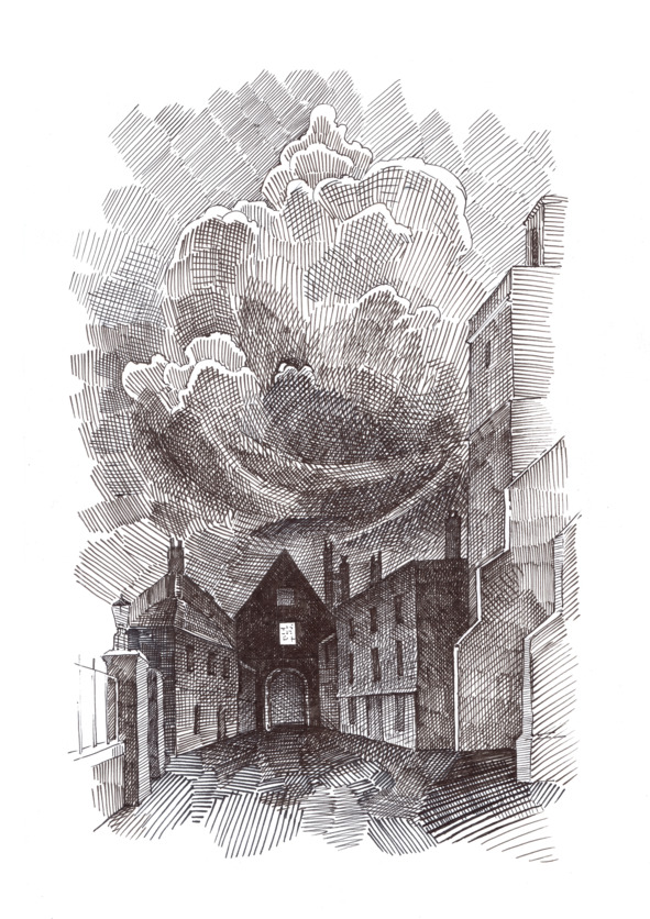 До назначенного часа остаётся ещё минут двадцать, и Эдвин проходит по улице дальше, до моста через реку. Он смотрит через парапет на холодную рябь воды, и грозные слова странной женщины снова и снова звучат у него в ушах. Во всём он видит теперь дурные знаки: в завывании ветра, в багровеющем закате, в дрожащих огнях на берегу, в печальном звоне колоколов на башне собора. Охваченный тревогой, он почти сбегает с моста и спешит к домику над воротами.