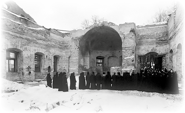 Словом, Казанский храм стоял тогда в совершенном и крайнем разорении. Вход, а точнее какой-то пролом в стене – был со стороны алтаря. Но понять, где именно здесь алтарь, где солея и основная часть храма – можно было только приблизительно. Земля вместо пола, как я уже сказал, была изрыта колесами техники, но в тот момент, когда мы жили в Оптиной, конечно, уже никакой техники в храме не было, а напротив, появлялись первые признаки начинающегося возрождения, а именно – вдоль стен внутри пространства храма можно было увидеть несколько холмиков на месте могил уж не помню кого, но конечно особенно почитаемых игуменов и архимандритов монастыря. Как эти могилки нашли, я не знаю, должно быть, по описаниям, а может быть, и какие-то остатки надгробных плит сохранились, в советское время ведь и с надгробными плитами не сильно церемонились и могли прямо по ним ходить и ездить. Увы, но такая психология культивировалась…