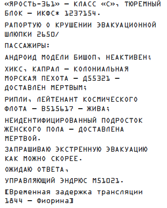 «Фиорина, “Ярость-361”», – гласили данные. – Очистительный завод минеральной руды внешней вуали. Трудовое исправительное учреждение с максимальной охраной». Для корабельного компьютера эти слова ничего не значили. Они значили бы многое для пассажиров, но те были не в состоянии прочесть что-либо и понять.