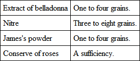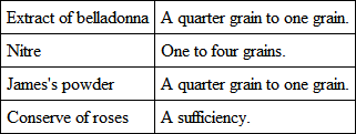 This will be the quantity for one pill; but a better effect is produced if the medicine be administered in smaller doses, and at shorter intervals. If the dog can be constantly attended to, and does not resist the exhibition of pills, or will swallow them readily when concealed in a bit of meat, the following may be given every hour: —
