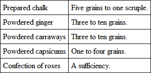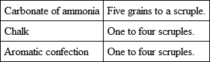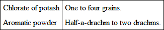 To the foregoing, from two to eight grains of powdered catechu may be added should it seem to be required, but it is not generally needed. Opium more than has been recommended, in this stage, is not usually beneficial; and, save in conjunction with ether, which appears to deprive it of its injurious property, I am not in the habit of employing it.