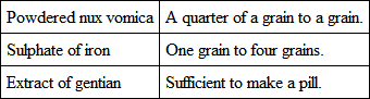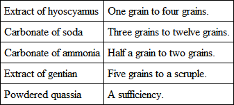 The treatment is simple. The dog must be put upon, and strictly kept upon, an allowance. Some persons, when these animals are sent to them, because the creatures are fat and sickly, shut the dogs up for two or four days, and allow them during the period to taste nothing but water. The trick often succeeds, but it is dangerous in severe cases, and needless in mild ones. This is a heartless practice, which ignorance only would resort to; but such conduct is very general, and the people who follow it boast laughingly of its effect. They do not care for its consequences. A weakly stomach cannot be benefited by a prolonged abstinence. I have kept a dog four-and-twenty hours without food, but never longer, and then only when the animal has been brought to me with a tale about its not eating. The report, then, is assurance that food has been offered, and the inference is that the stomach is loaded. A little rest enables it to get rid of its contents, and in some measure to recover its tone. The dog, as a general rule, does well on one meal a day; afterward, the food is regularly weighed, and nothing more than the quantity is permitted. This quantity may be divided into three or four meals, and given at stated periods, so that the last is eaten at night. When thus treated, animals, which I am assured would touch nothing, have soon become possessors of vigorous appetites. At the same time, exercise and the cold bath every morning is ordered; and either tonic or gentle sedatives, with alkalies and vegetable bitters, are administered. The following are the ordinary stomach-pills, and do very well for the generality of cases: —