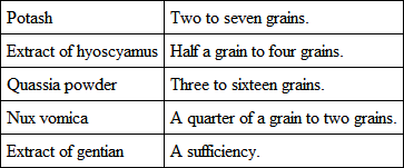 The reader, however, will not depend upon any one compound, for stomach disease is remarkably capricious. Sometimes one thing and sometimes another does a great deal of good; but the same thing is seldom equally good in any two cases. Stimulants, as nitrate of silver, trisnitrate of bismuth, or nux vomica, are occasionally of great service; and so also are purgatives and emetics, but these last, when they do no benefit, always do much injury. They should, therefore, be tried last, and then with caution, the order being thus: – Tonics, sedatives, and alkalies, either singly or in combination, and frequently changed. Stimulants and excitants in small doses, gradually increased. Emetics and purgatives, mingled with any of the foregoing. The food and exercise, after all, will do more for the restoration than the medicine, which must be so long continued that the mind doubts whether it is of any decided advantage. The affection is always chronic, and time is therefore imperative for its cure.
