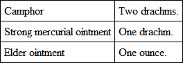 Medicine must be employed for two purposes; the first, to alleviate the pain and act locally on the disease; and the second, to amend the general health, checking the constitutional disposition to be affected. As a local application, Mr. Blaine recommends an ointment; which I object to, because I have found it aggravate the suffering without conferring any compensating benefit. Astringents, such as the acetate of lead, are not curative; but the following ointment has done so much good in these cases that I can most confidently submit it to the public: —