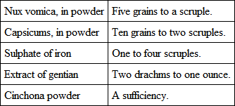 In such cases, when the dropsy is first observed, our care must be to invigorate the system. Small doses of nux vomica, with iron, gentian and capsicums, made into a pill, will generally do this, and the following form may be employed: —