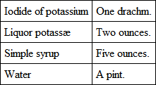 Hitherto, however, nothing has been said about any treatment of the part which is the immediate seat of the disease. If the fluid poured into the perinæum be excessive, the part must be laid freely open by two or three incisions being made along the entire length of the swelling. After this has been done, the liquid will not escape as from an abscess; for being held within the cells of the membrane that lies immediately under the skin, comparatively little of it is released from the knife. A fine pair of scissors will be required to snip the separate bags or bladders; but that operation must be performed with caution, else injury may possibly be done. The business being concluded, let the parts be afterwards dressed with the tincture of iodine, or a tincture of the iodide of potassium, of the strength of a drachm to the ounce of proof spirit; this being preferable to water for a solution in these cases. Into the rectum also injections should be thrown at least three times a day, and all of these ought to be of a tonic and stimulating kind, being used perfectly cold. Either of the following may be administered: —