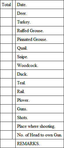 This will be found as convenient a form as any for recording the season's bag, and I would suggest as a means to accurately determine the number of shots, to put a given number, say 50 or 80 caps, into your cap pocket every day on going out, deducting any miss-fired and wasted ones from the balance left on returning. This will give you an exact idea of your average shootings, which will be found not to exceed three out of five shots. In the column of remarks you can state your companion, quantity of game seen, &c.; in fact, any point worthy of notice, and to which afterwards you can refer. The writer's book dates back to 1845, and records every head of game killed while he was out, by his own, as also his friend's gun, remarks on the weather, curious ornithological observations, &c.