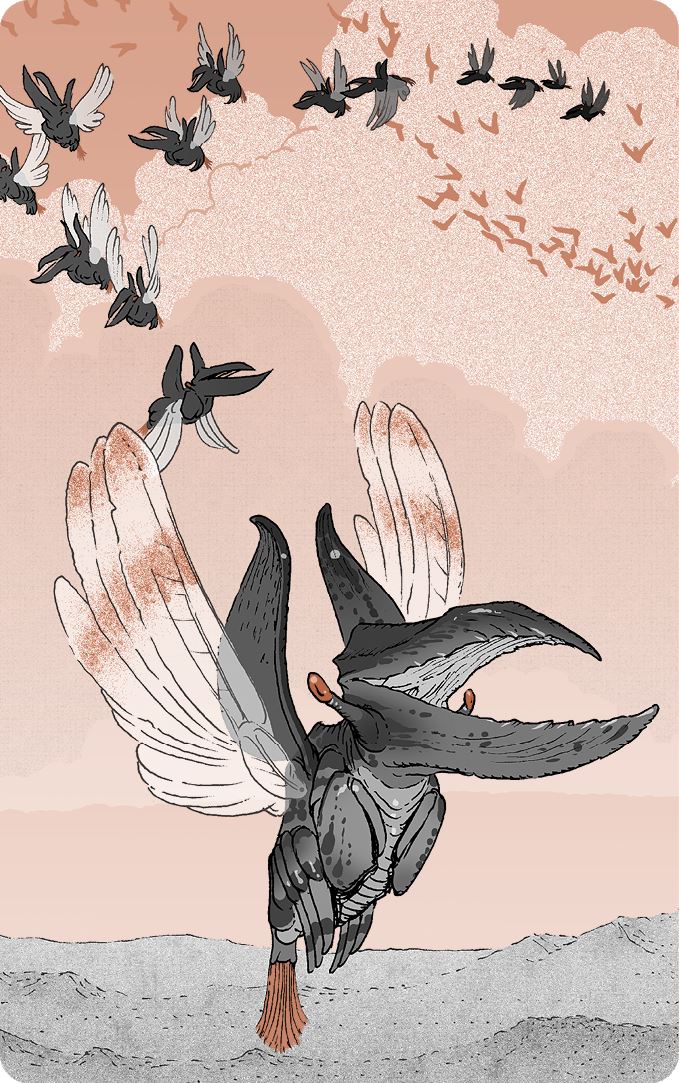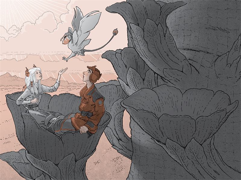 Зиа провела рукой по гладким перьям птицы, та негромко заклекотала и взлетела. Двое путников приставили ладони козырьком ко лбу, защищая глаза от солнца, и посмотрели на удаляющегося вертиплавника. Хлопая тремя парами крыльев, он присоединился к стае, кружащей над деревом. Выполнив несколько фигур высшего пилотажа, их птица отделилась от стаи и полетела на запад, к Блуждающему лесу.