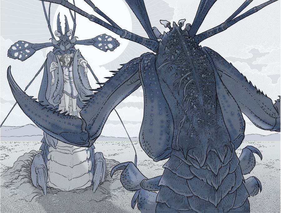 Зиа обернулась и увидела нависающего над ней громадного песчаного снайпера. Чудовище представляло собой просто немыслимых размеров ракообразное песочного окраса, вооруженное целым арсеналом шипастых клешней и зазубренных хваталок. На голове у него, над кордоподобными усиками и веслообразными антеннами, независимо друг от друга вращались два выпученных глаза. Снайпера – а точнее, самку снайпера – окружал целый выводок цокающих и цыкающих нимф.