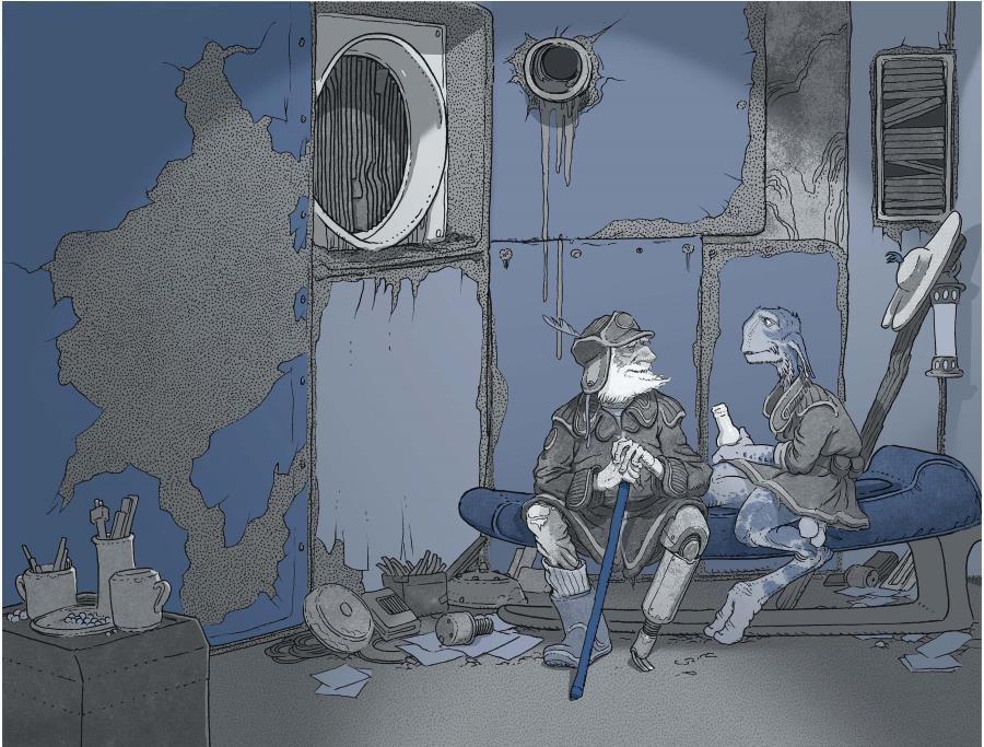 Из темноты, хромая и опираясь на палку, вышел старик. Топ-пщщщ. Топ-пщщ. Его сухощавое тело прикрывала замызганная грязно-коричневая длинная куртка – почти как у Ровендера. Истрепавшийся летный шлем венчал лысеющую голову. Грязь на щеках резко контрастировала с белыми волосами и бородой. Он приложил скрюченный палец к губам и прошептал: