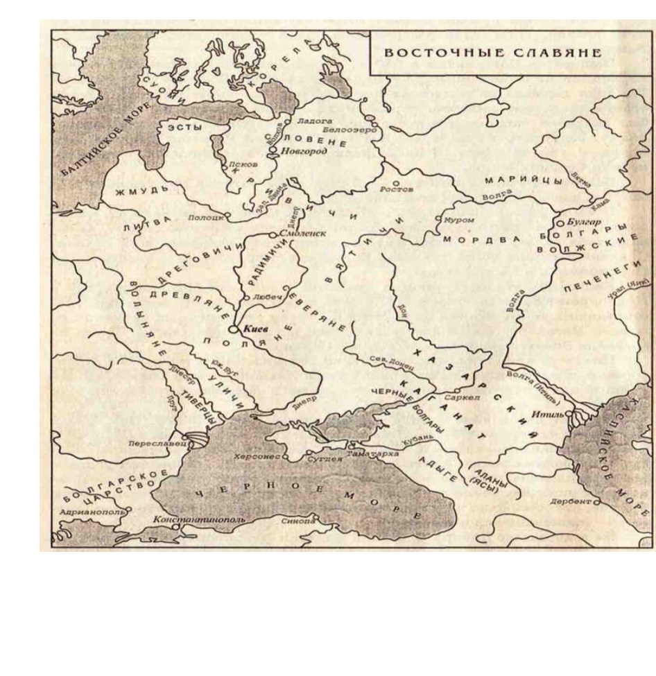 Племена, которые поселились между Припятью и Двиной, назывались дреговичами; другие «сели» по Двине в том месте, где в нее впадала речка Полота, и получили название полочан. В верховьях Волги, Днепра и Западной Двины поселились кривичи, их главным городом был Смоленск. Радимичи и вятичи, по летописи, произошли от рода «ляхов» (поляков). Славяне, расселившиеся вокруг озера Ильмень, назывались словенами новгородскими, или ильменскими; их главным городом был Новгород (рис. 1).
