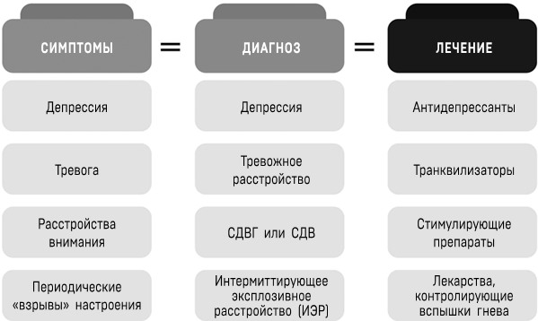 Или вы можете сказать: «У меня депрессия». Врач поставит вам диагноз, название которого совпадает с вашими симптомами – в данном примере это будет депрессия – без учета какой-либо биологической информации. Лечение, как правило, будет заключаться в приеме антидепрессантов.