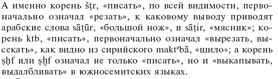 А именно корень šṭr, «писать», по всей видимости, первоначально означал «резать», к каковому выводу приводят арабские слова sāṭūr, «большой нож», и sāṭir, «мясник»; корень ktb, «писать», первоначально означал «вырезать, высекать», как видно из сирийского maktebā, «шило»; а корень ṣḥf или ṣḫf означал не только «писать», но и «выкапывать, выдалбливать» в южносемитских языках.