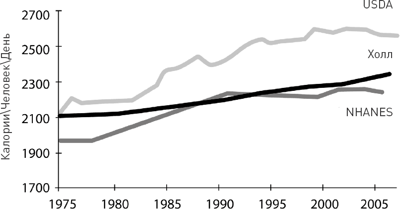 Рис. 3. Количество потребляемых калорий взрослым населением США с 1978-го по 2006 год. Данные взяты из отчетов министерства сельского хозяйства США (USDA) с учетом оценки пищевых отходов и доступности продовольствия, из программы Обследование состояния здоровья и питания (NHANES) Центра по контролю и профилактике заболеваний (CDC) и из статьи К. Холла в журнале PLOSOne 4 (2009): е7940. Мы выражаем отдельное спасибо К. Холлу за предоставленные первичные данные.