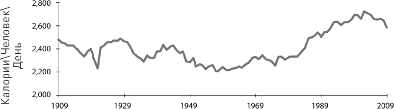 Рис. 4. Количество потребляемых калорий на человека в день в США с 1909 по 2009 год. График составлен на основе данных министерства сельского хозяйства США и службы оценки доступности пищевых продуктов. Мы составили схему, сложив вместе калории, полученные из протеинов, жиров и углеводов, отняли общий процент пищевых отходов 28,8 % с учетом изменения метода оценки жидких масел с 1999 по 2000 годы